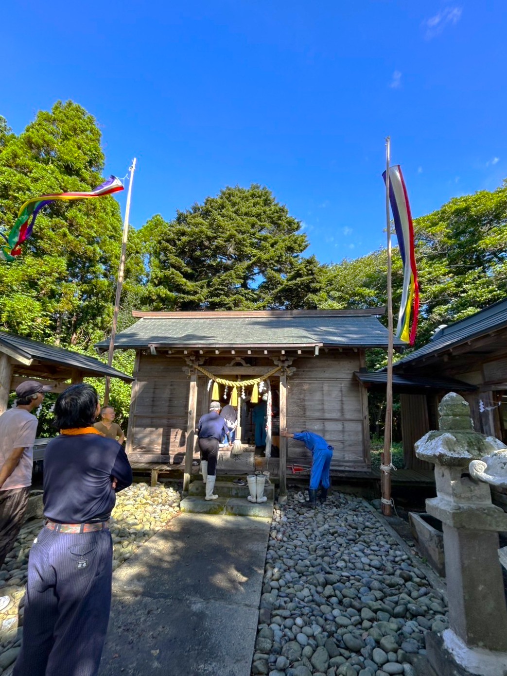 ↑ 島民でお祭りの準備をしています。神社の掃除や本殿の飾りつけなど様々な準備をします。