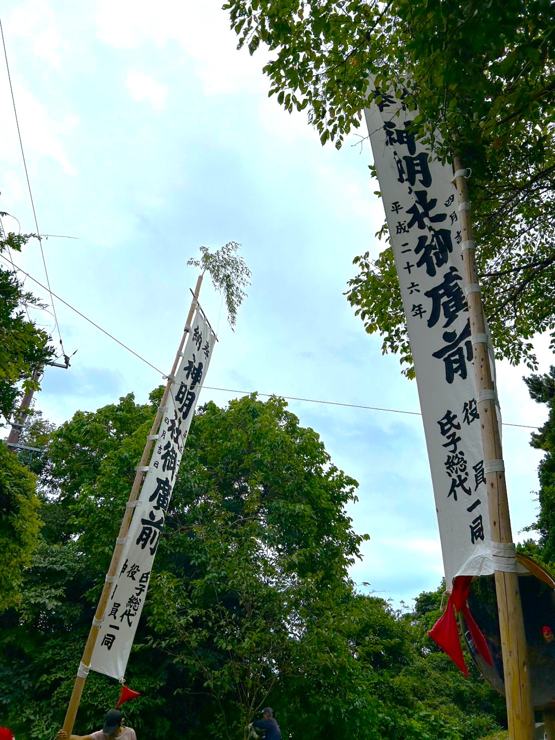 ↑ 鳥居の前の入り口に旗を立てます。神社全体が彩られ、いつもの静かな寒風沢神明社とは違い華やかになります。